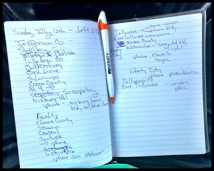 This is where I keep track of every state, town and county that I travel through during the run. It is also the place I mark down the locations of my image captures, giving me a written diary of where I went, what I shot and how I got there. I also jot down reminders to myself, notes about places I’d like to come back to and anything else I don’t want to forget. For both my style of photography and record keeping, this kind of note-taking is absolutely required. If only I had been this disciplined during my high school and college days.