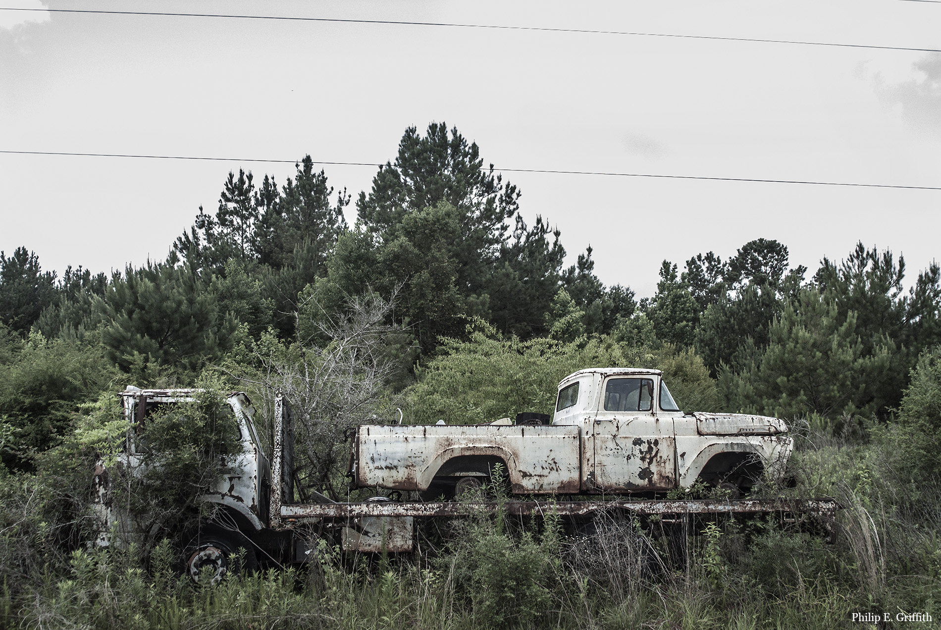I have had an eye for roadside imagery since my time at the University of Montevallo, but it was not such a dedicated part of my portfolio like it is now. I have often made the comment that all of us in the UM art department at that time were influenced in some way by the photographs on the front and back of REM’s “Murmur” album. The landscape engulfed by kudzu was something we walked by or drove through everyday, it did not exist “somewhere else”, it was right in our backyard. And the experience from that time period in my life is something I still carry with me to this day. Although most of my work recently has been done along the back roads of Illinois, my “southerness” still manages to show through in the way I interpret the scenes. And that is something I am very proud of and I hope will never change.